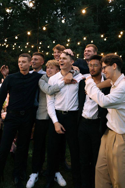 Джентльмены: Костюм или сочетание рубашки и брюк. Классические тёмные цвета всегда уместны, но, если захочется, можно опираться на палитру этого дня